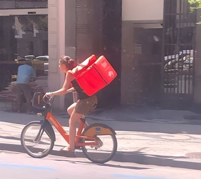 En la imagen una joven pedaleando sin casco, sin empleo y sin derechos laborales, entregando comida de un restaurante que no es donde trabaja, a alguien que pidió vía una App millonaria (que cobra buena comisión), y que tampoco es donde trabaja.
