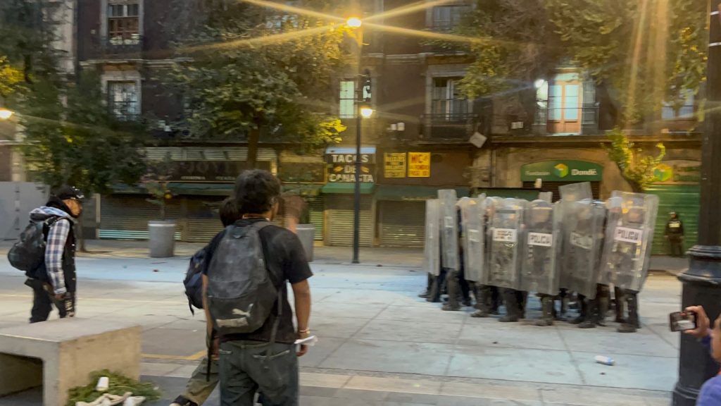 En el zócalo capitalino, punto final de la manifestación, se reportaron encontronazos con palos y piedras entre manifestantes y policías, por lo que las personas que se encontraban en el primer cuadro del Centro Histórico unas se retiraron y otras buscaron donde refugiarse.