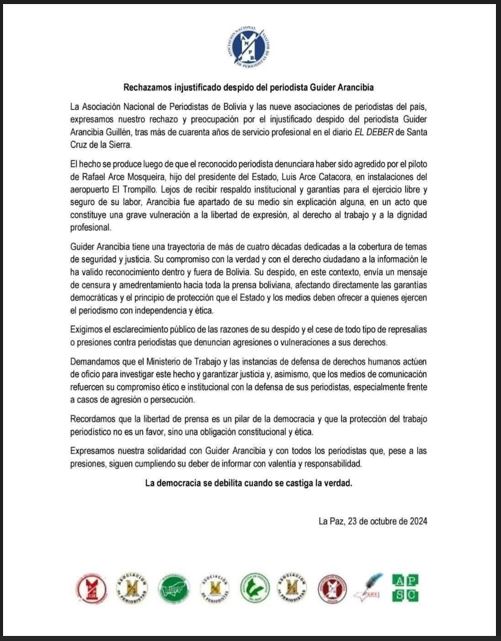 En una cobertura en el aeropuerto El Trompillo de la ciudad de Santa Cruz, el pasado 22 de agosto, el periodista Guider Arancibia del periódico El Deber fue agredido y amenazado por un capitán de aviación, quien, además, le arrebató y destruyó su teléfono celular, y lo expulsó de la terminal aérea.