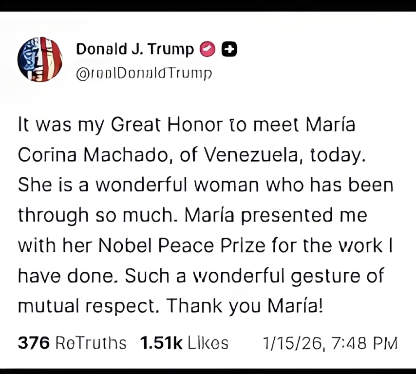 Según la publicación de Trump, Machado le presentó su Premio Nobel de Paz “por el trabajo que he hecho”.