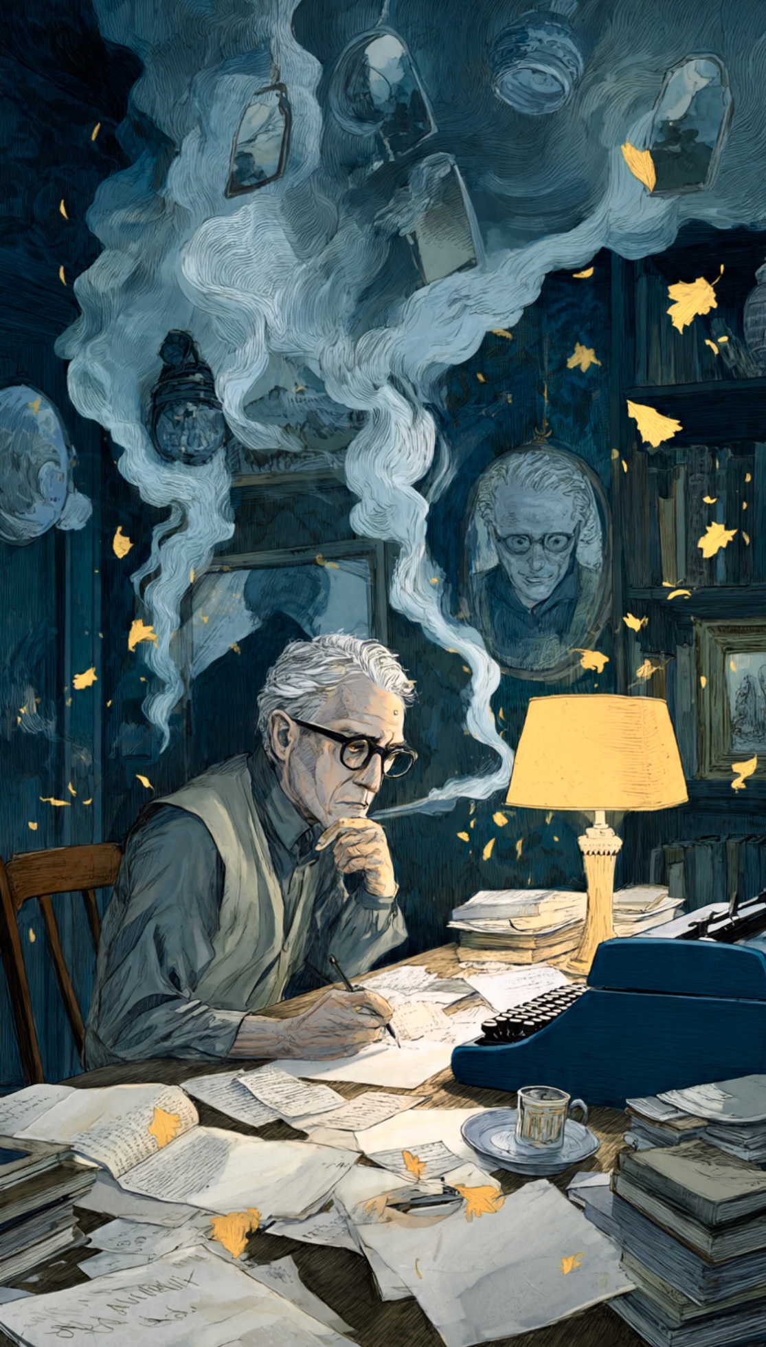 Me describo en textos frente a espejos imaginarios que no reflejan la cara sino el tiempo, el silencio y la soledad, que son las tres edades que tiene un hombre cuando ya no tiene otra. Sigo reflexionando frente a mi antigua computadora azul, encima de una mesa comedor de donde, —por cierto— siempre me corren, porque la literatura no paga la cuenta del mercado y la comida siempre tiene prioridad sobre las páginas. Supongo, gajes de la limitación y la escasez, que son las dos musas que ¡gulp! nunca me abandonan.